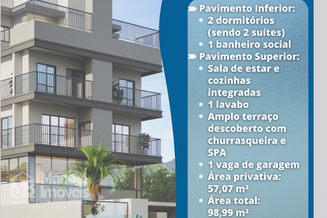 Sala de estar e cozinha integradas, 01 lavabo, amplo terraço descoberto, com churrasqueira e SPA. 01 vaga de garagem. -Área privativa 57,07 m² -Área total 98,99 m².