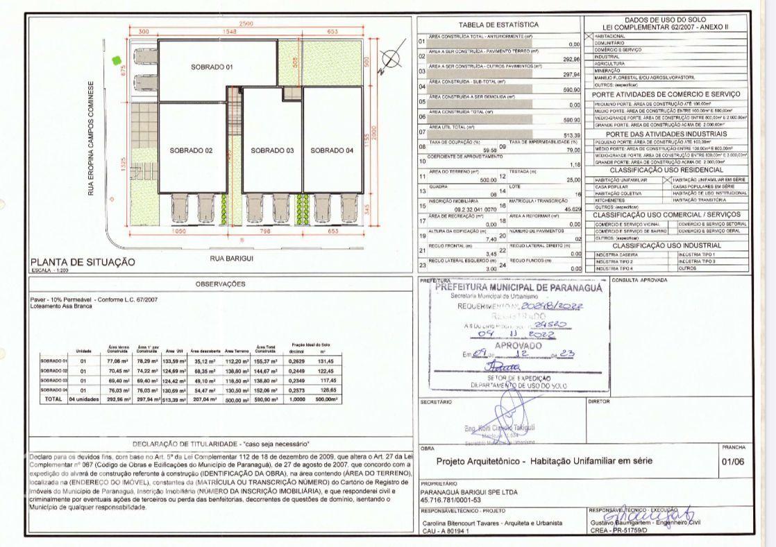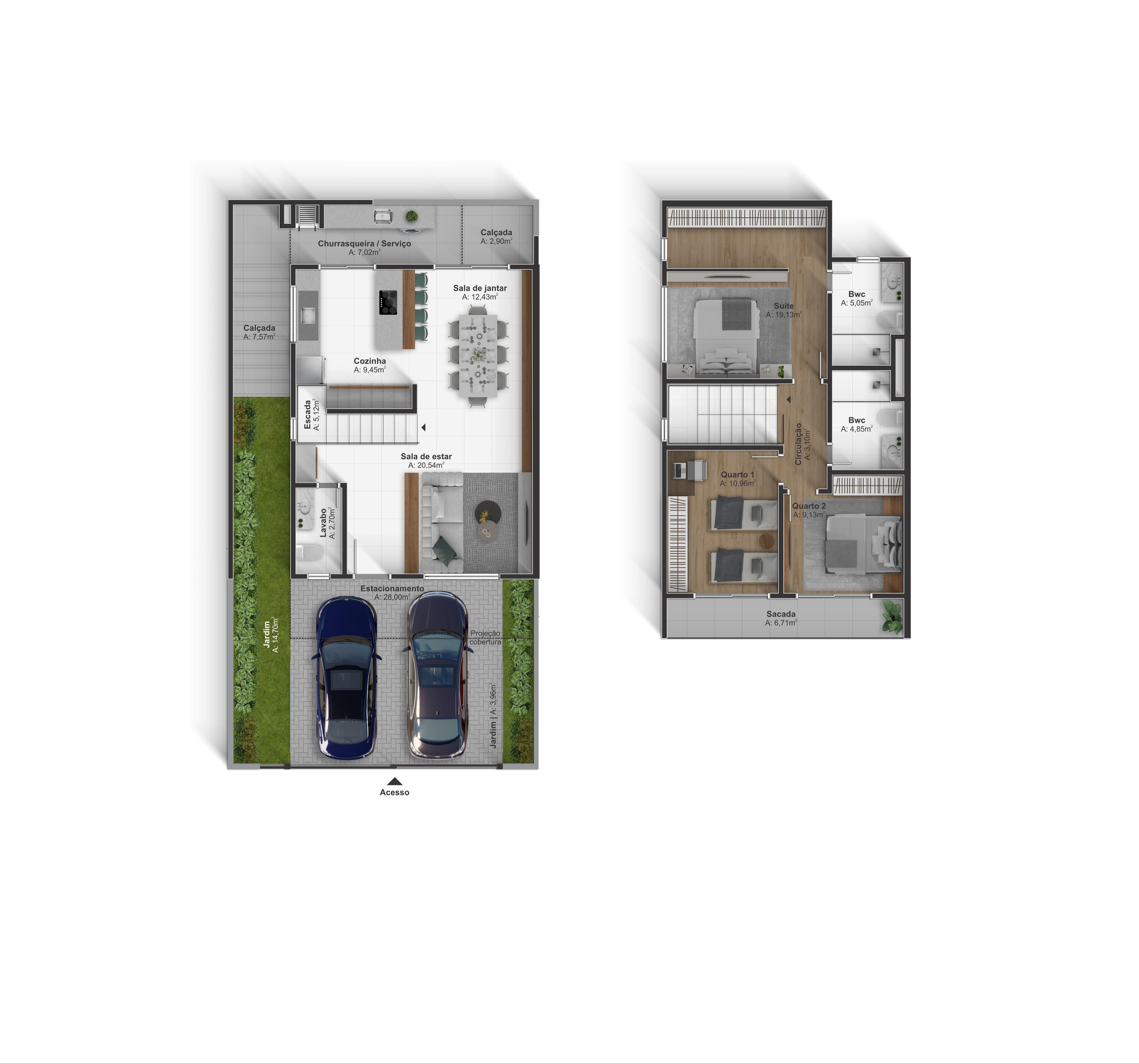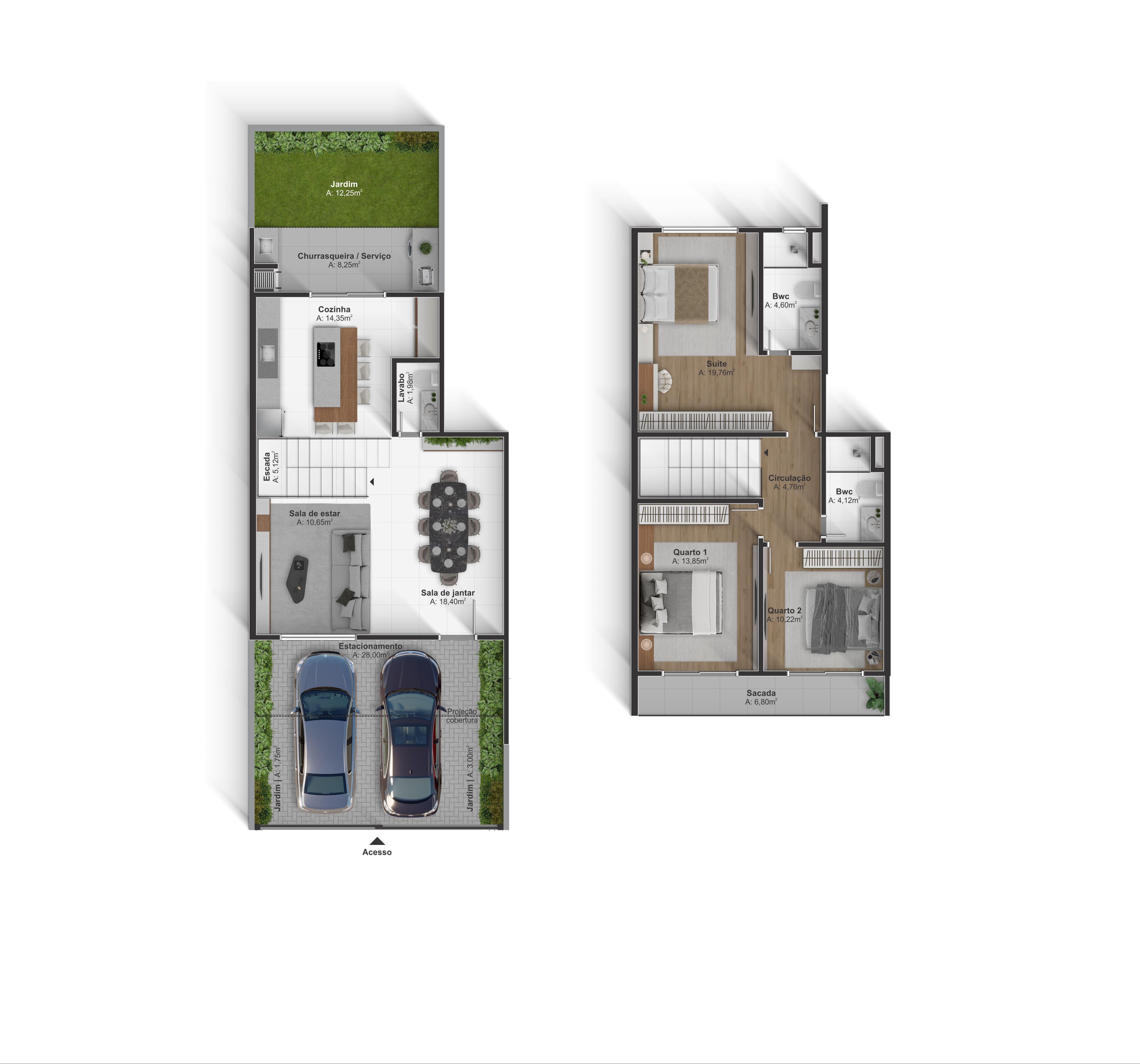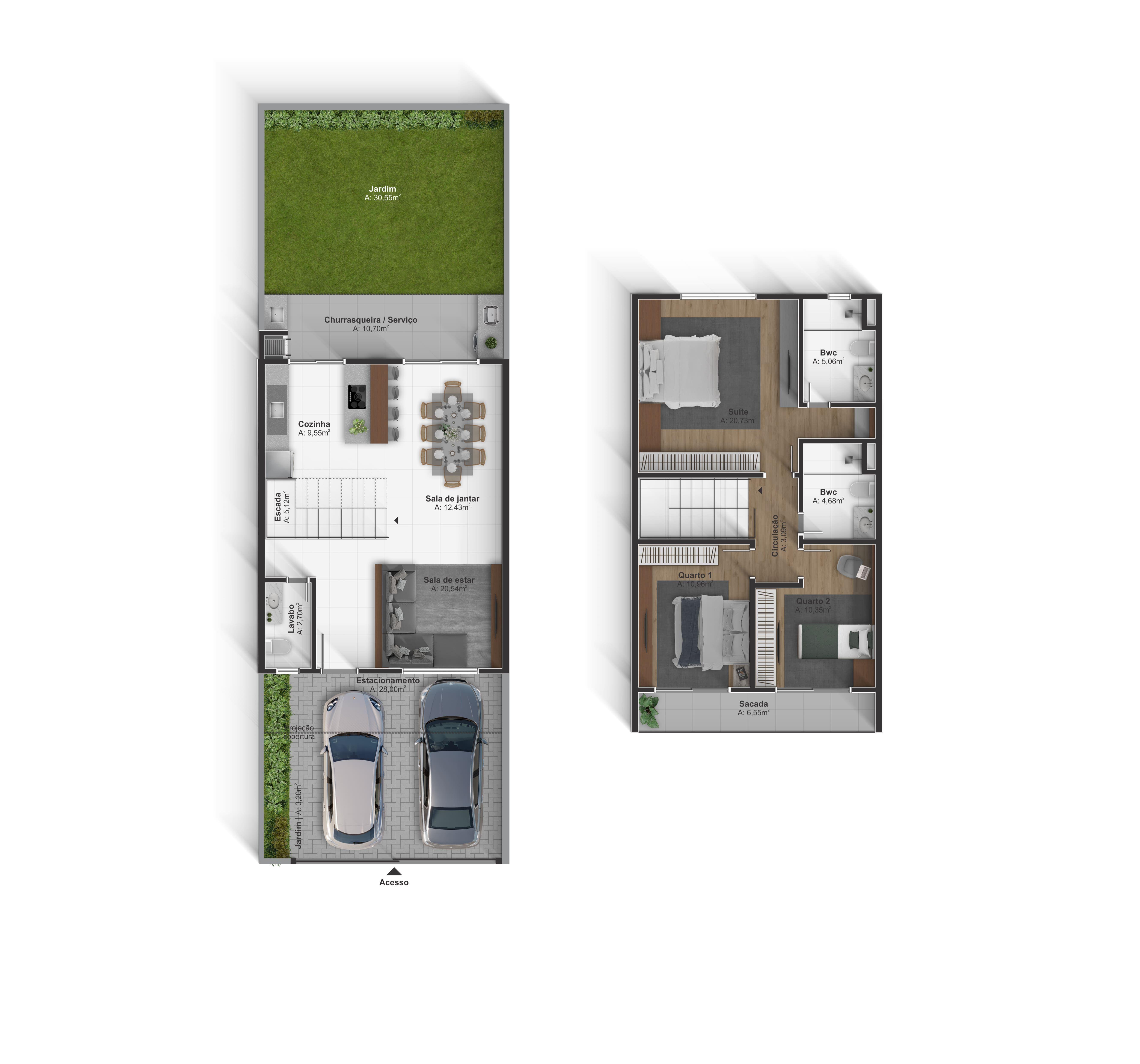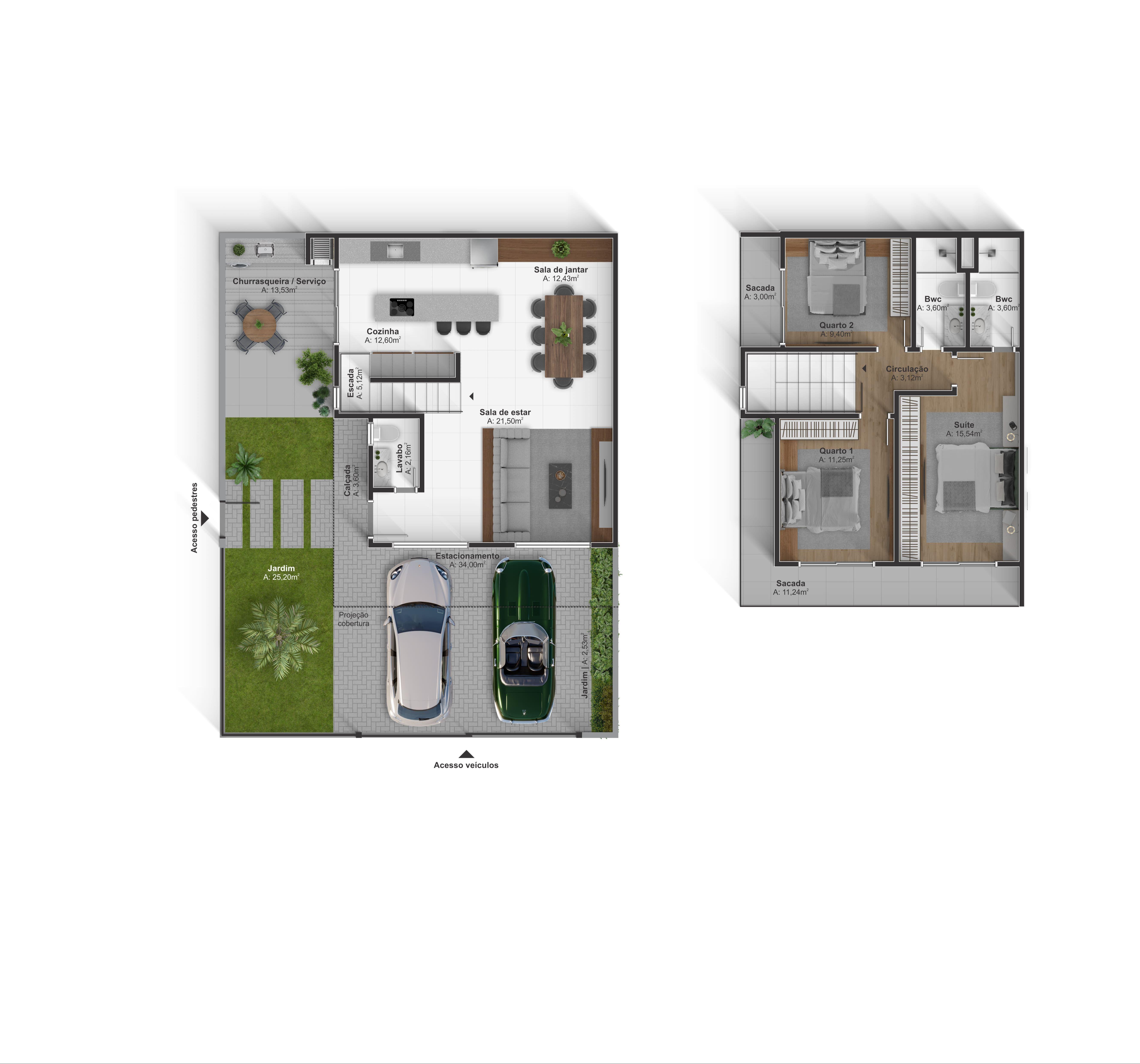 Sobrado 01 são 133,59m² de área útil com 155,37m² de área total