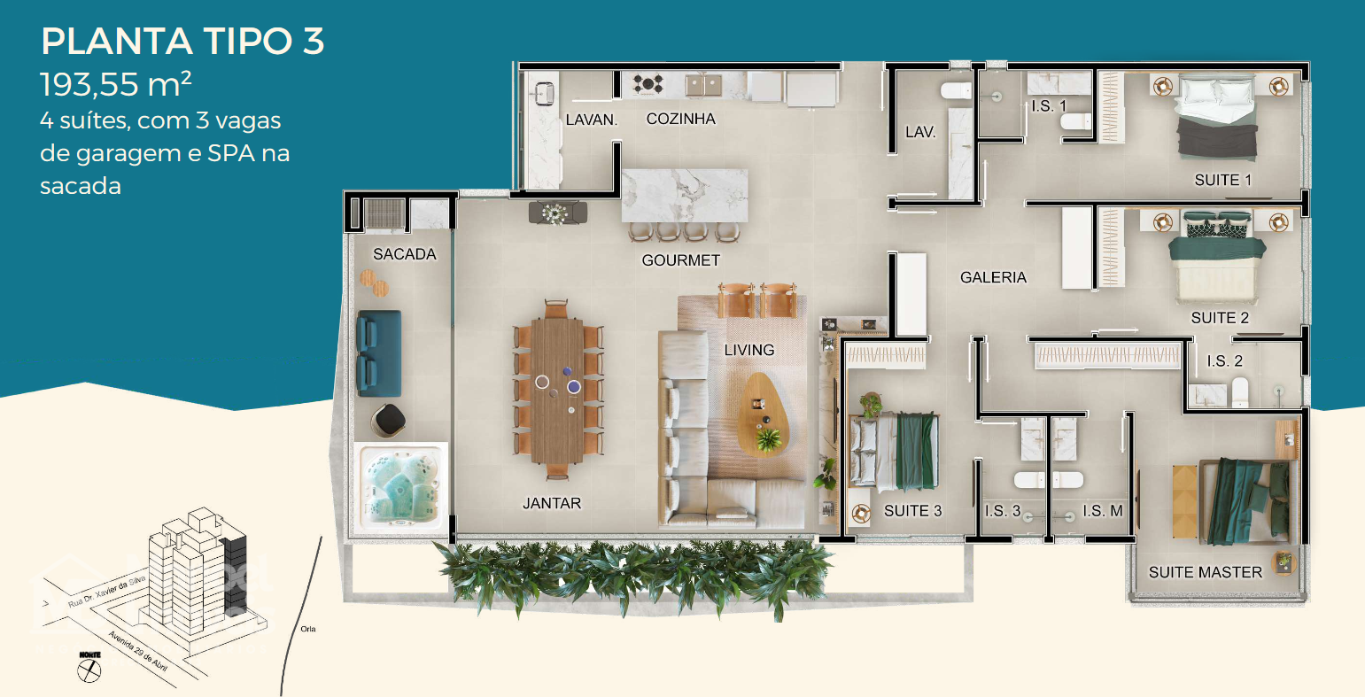 153,25 m² privativos – 3 suítes, 2 vagas de garagem e um SPA privativo na sacada, para momentos de puro deleite.