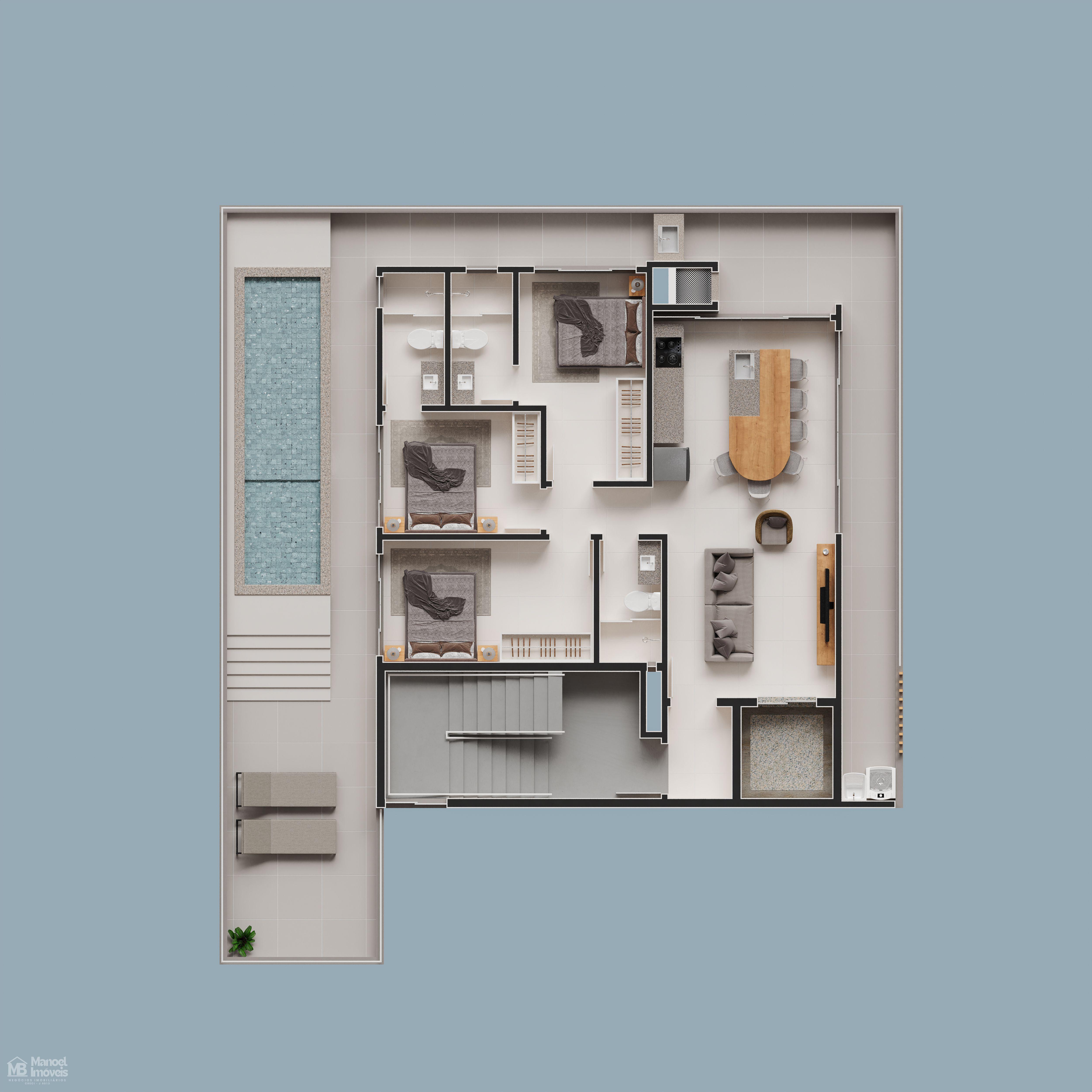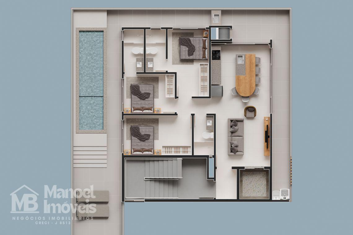 Layout: 3 quartos, sendo duas suítes, para garantir privacidade e aconchego.