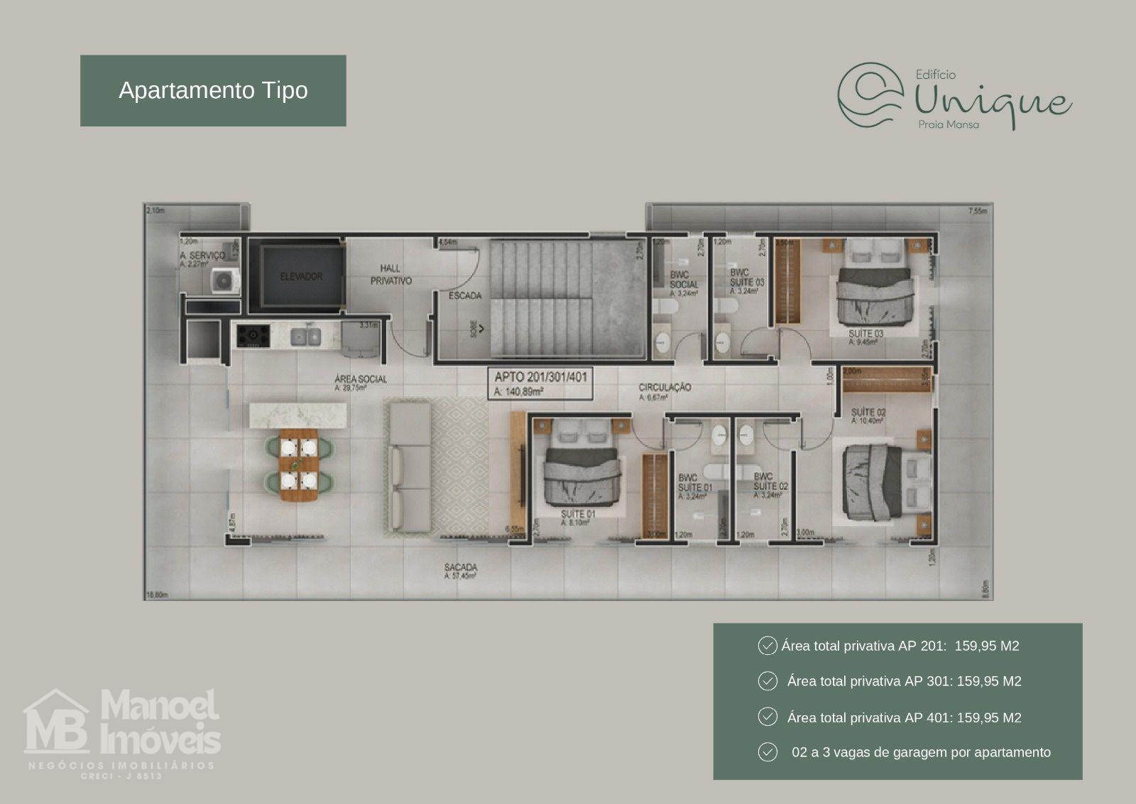 Apartamento tipo 201 , com área total privativa: 140,89m² área privativa total 159,95m²
